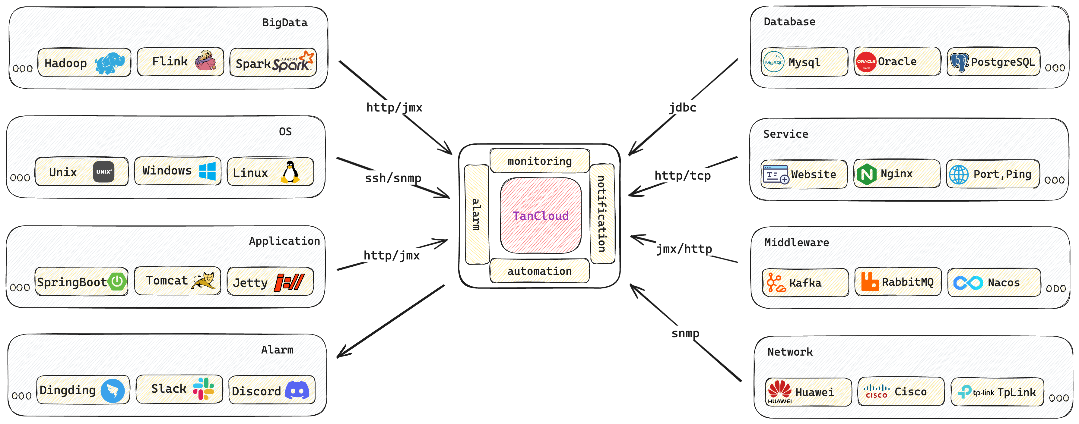 • Monitoring web, database, cache, os, server, middleware, bigdata, cloud-native, network etc